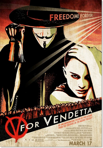 Evey (Natalie Portman) vive, como muitos ingleses retratados no futuro próximo dos Wachowski, sob o comando de um governo totalitarista. A ditadura impera soberana em todos os aspectos cotidianos da população: são impostos toques de recolher, telefones são grampeados, companhias de comunicação são estatizadas, rígidas forças especiais, nomeadas de Homens-Dedo, guardam as ruas. Forças corruptas, que não se diferem do restante dos governantes e policiais nesse aspecto. Dentre as atrocidades de autoria dos Homens-Dedo, poderia-se contar o estupro de Evey Hammond - não fosse a interferência de um esguio indivíduo mascarado que a protegesse do infortúnio de ter cruzado com os policiais em horário proibido. Vociferando eruditismos e galanteios românticos, o homem se identifica como, simplesmente, V (Hugo Weaving). Em poucos minutos, presenciamos o primeiro ato conspiracionista do mesmo, implodindo, ao som de Tchaikovsky, um prédio do governo. Não por acaso, a máscara usada por V é a face de Guy Fawkes. A partir de então, Evey se vê enveredada pelas peripécias de seu salvador, caçado como terrorista. Envolvida na busca do ideologista pela consciência política da população, para o fim do comodismo ante às autoridades absurdamente totalitárias, e, principalmente, por vingança em nome de atrocidades cometidas pelos ditatoriais governantes no passado, Evey se envolve profundamente com V. Interessante notar que o vingador não assume sua identidade em momento algum do filme, somente se caracterizando por seu símbolo, semelhante ao da anarquia. Desse modo, percebe-se a intenção em representar, nele, a sociedade que usa do direito de se indignar, de exercer sua cidadania. V é uma entidade simbólica que, na realidade, não é um só indivíduo - ou, se preferível, é toda a humanidade em um só emblema. Enquanto os políticos, imundos suínos chafurdantes em alienado patriotismo, se desesperam com a incapacidade em deter o terrorista, nos é revelada, não em seqüência cronológica, mas sim por meio de flashbacks, a história de vítimas de experimentos bioquímicos e golpes financeiros executados pelo Estado. Nela, estão inseridas todas as personagens do enredo, seja de modo direto ou indireto. V passa a tutor de Evey, construindo nela seu alter ego ideal e guiando sua criatura para a perda total do medo da afronta. Durante o processo de amadurecimento dela, vê-se claramente a porção de alienação que tomava parte de sua mentalidade antes do aparecimento da figura tutelar de V. Unida a essa percepção, um analógico trabalho da direção do filme pode ser percebido em várias simbologias da película, tais como a bandeira do partido ditatorial semelhante à suástica nazista; a posição fetal que a garota assume nas cenas em que aparece definhando na cela, retratando seu renascimento interior; ou mesmo as experiências grotescas similares às dos campos de concentração alemães. Ao todo, a obra leva seu espectador à reflexão. Dessa vez, não tão existencial como em Matrix, mas política, lidando com o papel individual na sociedade e o poder cidadão. O final convida abertamente todos a se unirem em um só brado aos ultrajes governamentais, sugerindo preceitos anárquicos e privando qualquer humano de abusos desnecessários. É válida a intenção da obra em oferecer nitidamente a concepção do sistema a que se pertence, fornecendo a noção de que cada qual faz parte de um todo e que uma peça basta para desencadear o caos em uma unidade. Ovações ao efeito dominó à parte, lembrem-se sempre do 5 de novembro.