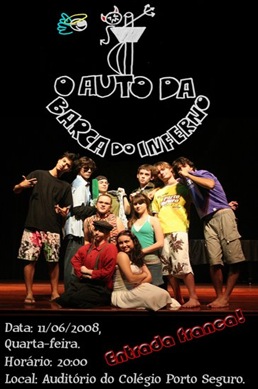Montada pelo segundo ano consecutivo por alunos do ensino médio, “O Auto da Barca do Inferno” estréia em Junho com divertidas mudanças. A peça é baseada no célebre trabalho de Gil Vicente que une, de forma tragicômica e moralista, alegoria e sátira. As estruturas são as mesmas: estereotipadas figuras se submetem ao julgamento do benévolo Anjo e do ácido Diabo, desesperadas por saber se passarão o resto de seus dias no Céu ou no Inferno. Porém, nem tão similar à obra de Vicente é essa montagem.
