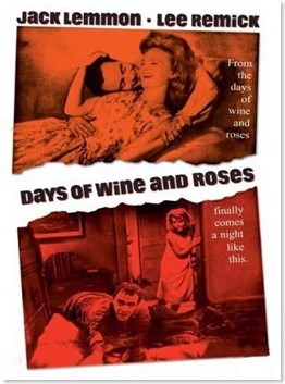 Estrelando Jack Lemmon e a então estreante Lee Remick, ostentando 5 indicações ao Oscar - incluindo a estatueta de Melhor Canção Original, Vício Maldito (Days of Wine and Roses), 1962, trás à tona a lenta e cruel derrocada do alcoolismo na sociedade norte-americana nos anos 60. Dirigido por Blake Edwars e baseado em romance de J.P. Miller, o filme carrega fortes influências do film noir, sendo inúmeros os conflitos internos das personagens principais e a duplicidade moral das mesmas, somadas ainda às tomadas individuais com focos nítidos em rostos e a simbólica e clássica presença de cenas noturnas e sombras sobrepondo-se à face, corpo e movimento dos atores.